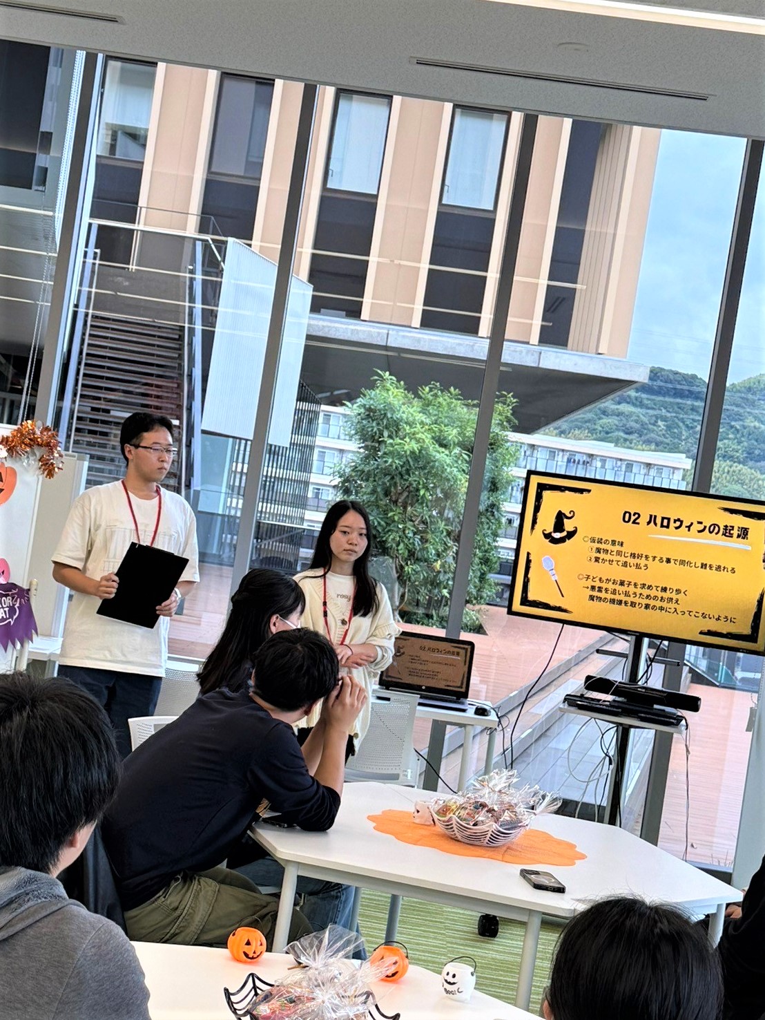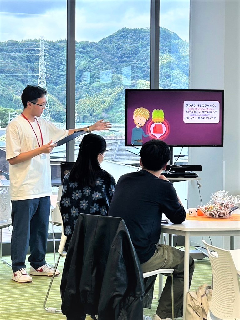 当日は英米語学科の学生が多く参加していたため、ハロウィンにちなんだ英語のイディオムを、クイズ形式で紹介しました。楽しみながら英語を学べている様子で、イベントを通した語学学習にも繋げることができました。