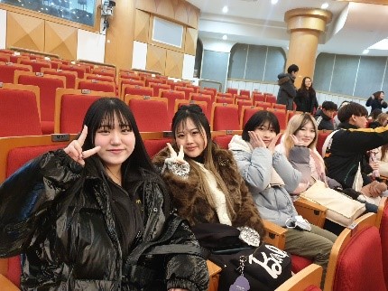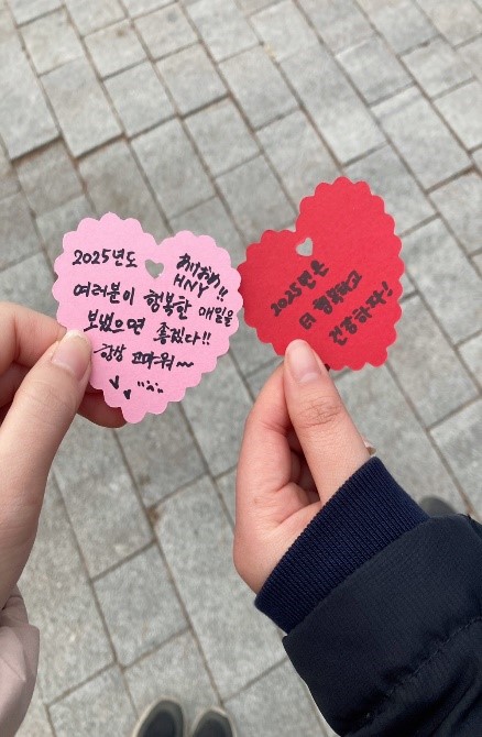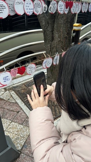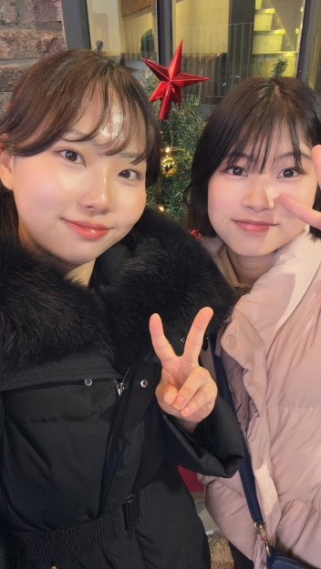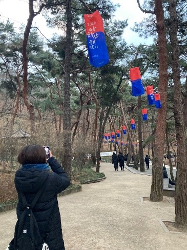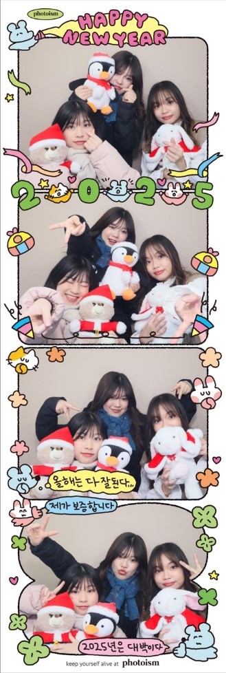 ルームメイトと香港のお友達と一緒に夜ご飯を食べました。2024年最後にプリクラを撮って、寄宿舎で年末はジャンプをしました。次の日の新正月(1/1)は朝5時に起きて、아차산(アチャ山)に登り、日の出を見に行きました。曇っていて綺麗に見えませんでしたが、下りながらぼんやり浮き出た日の出を写真に撮ることができたので、良かったです。最後に、今年の願いをお守りに書いて飾りました。個人的に日本では、日の出を見に行く習慣がなかったので、ルームメイトから誘いを受け、初の体験が韓国でできて、とても楽しかったです。