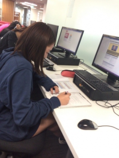写真は、GELIにあるIndependent Learning Centre通称ILCで自主学習しているときの写真です。クラスのレベルに合わせた学習が、学校でも自宅でもオンラインでできるシステムになっているのでとても便利です。