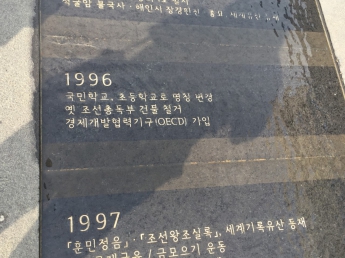 下を見てみると韓国の歴史が1年ごと書かれている石碑があったので、私たちが生まれた1996年の石碑を撮ってみました。