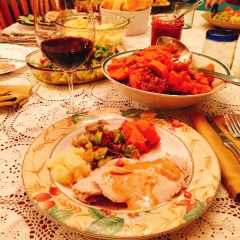 ホストマザーの親戚が家に来てみんなで食事を楽しみました。私の家ではターキーにgravyソースをかけて食べました。食後にはパンプキンチーズケーキを食べました。ホストマザーの料理はとても美味しいです。