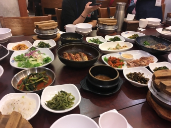 昼食は한정식(韓定食)を頂きました。数種類のキムチやチャプチェ、焼魚など、豊富な種類のおかずがありとても満足することができました。