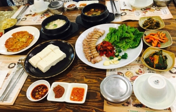 昼食には豆腐料理や보쌈(ポッサム)というゆでた豚肉をキムチや青唐辛子などと一緒にサンチュに包んで食べる料理を食べました。