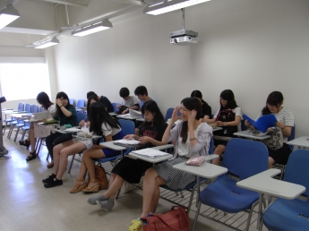 私達は8月28日、29日と2日間に渡り、会話と文法のテストを受けました。1日目は、会話テストがあり3人1組になり、授業で習ったフレーズなどを使い、5分間の発表がありました。2日目は、文法のテストでした。リスニング、ライティングに分けられ、授業内容の範囲が出題されました。
