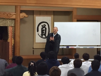食事の後は、和尚さんの講話です。新入生たちは無駄なお喋りもせず、講話に聴き入っていました。