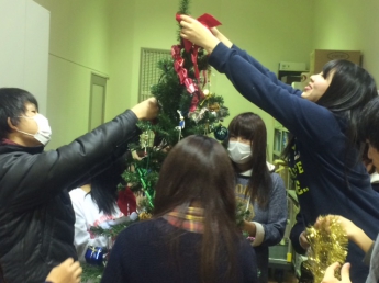 今回の授業では、校舎各所にクリスマスツリーの設置と飾り付けを行いました。病院や施設でもこういう飾り付けのイベントがこころを和ませ、つらい闘病生活を癒やしてくれるものです。学生さんたちもそのあたりが理解できたかな?
