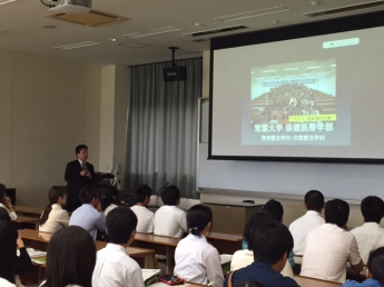 理学療法学科の模擬授業は、髙木教授の「障害を予防しよう」です。見学者のかたへの質問も交えて和気藹々とした模擬授業でした。