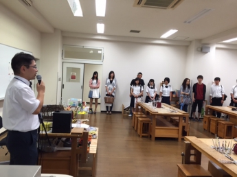 模擬授業の後は校内見学。画像は、中村准教授による作業療法学科の授業の説明を熱く語っているところです。革細工や木工など、様々な作業を通じて対象者の機能回復のお手伝いをする、それが作業療法なのです。