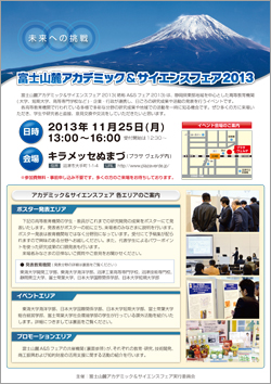 富士山麓アカデミック&サイエンスフェア2013(略称A&Sフェア2013)は、静岡県東部地域を中心とした高等教育機関(大学、短期大学、高等専門学校など)・企業・行政が連携し、日ごろの研究成果や活動の発表を行うイベントです。