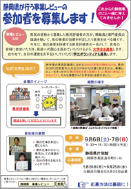 静岡県庁より、9月6日(土曜日)、7日(日曜日)に実施する事業レビュー県民評価者(大学生枠)募集のお知らせです。