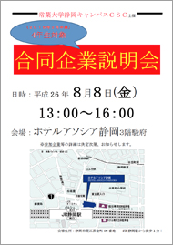 静岡キャンパスキャリアサポートセンター主催にて、4年生(2015年3月卒業予定者)を対象とした「合同企業説明会」を下記の通り開催します。