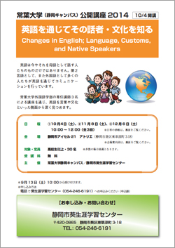 平成26年度 常葉大学静岡キャンパス(瀬名校舎)の公開講座が10月4日(土曜日)からスタートします。