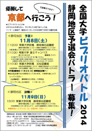 11月8日(土曜日)、9日(日曜日)に、本学大学祭にて、「全国大学ビブリオバトル2014 静岡地区予選会」が行われます。