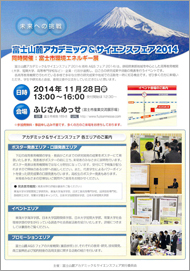 富士山麓アカデミック&サイエンスフェア2014は、静岡県東部地域を中心に富士山に縁のある高等教育機関(大学・短大・高等専門学校など)・企業・行政が連携し、日ごろの研究成果や活動等のポスター発表を中心に行うイベントです。