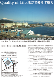 静岡県、公益社団法人ふじのくに地域・大学コンソーシアム、常葉大学法学部 地域法政策研究・実践センター主催の共同公開講座「クオリティ・オブ・ライフ~地方都市で暮らす魅力」-第1回 オープンデータを使った地域課題の解決と地方都市の暮らし-が、9月25日(金曜日)に本学静岡キャンパス水落校舎にて行われます。