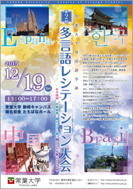 今年、第2回を迎える「多言語レシテーション(暗唱・朗誦)大会」は、常葉大学外国語学部創設30周年を記念して2014年に始まりました。この大会は学部創設以来の伝統と定評ある英語・スペイン語教育だけでなく、中国語・韓国語・ブラジル(ポルトガル)語も加わった、グローバルな外国語学部の学びを、学生とともに楽しむことができるイベントとして企画・実施されています。