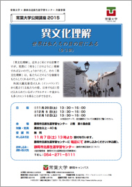 | 2015年12月12日(土曜日) 13時30分~15時00分 | 外国人観光客と外国人住民の声から学ぶ異文化理解 ──日本人は「変」? | 外国語学部 清ルミ教授 |