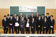 2013年1月30日(水曜日)G101教室にて、ふじとこ未来塾学生発表会を開催しました。6団体が、日頃の研究成果を決められた時間内でプレゼンテーションを行いました。学内審査員4名、学外審査員3名による採点で、最優秀賞、優秀賞等に木宮学長より賞状と記念品を授与されました。