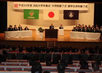 キャンパスも春の訪れを迎える中、本日ここに、多数のご来賓ならびに保護者の皆さまのご臨席を賜り、平成24年度浜松大学、浜松大学大学院および浜松大学留学生別科の卒業式、修了式をこのように盛大に挙行できますことは私達の大きな喜びとするところであります。本学を代表し、ご出席の皆さまに心より御礼申し上げます。