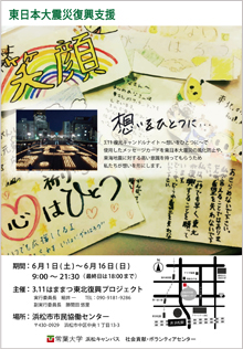今回、震災に対する浜松キャンパスの学生らの活動と子供たちのメッセージを展示し、震災の風化防止・これから起きると予想されている東海地震に対する高い意識を多くの人々に持って貰いたいとの目的から、以下の企画「想いをひとつに…」を行います。