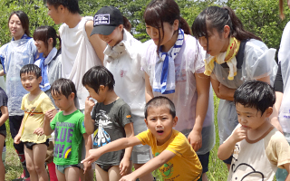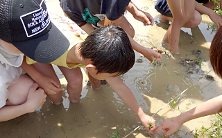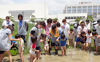 健康プロデュース学部こども健康学科の「自然環境基礎演習Ⅰ」で、都田保育園の年長園児たちと学生による田植えが行われました。