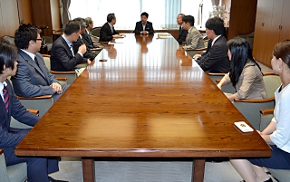 木宮岳志常葉学園常務理事と法学部教員が6月27日(金曜日)、静岡市役所に田辺信宏市長を表敬訪問しました。木宮常務理事が新設の法学部と地域法政策研究・実践センターについて市長に説明し、八木保夫法学部長以下訪問した11人の教員を紹介しました。