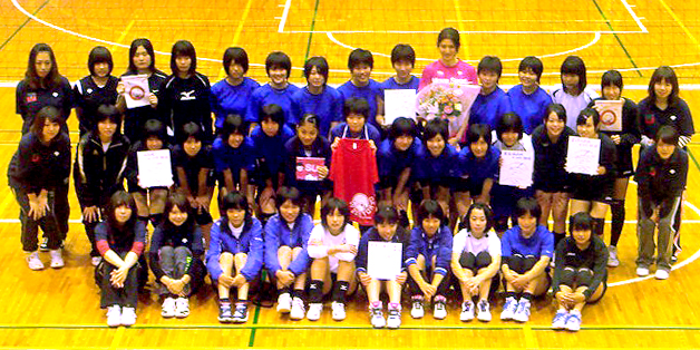 第2部は地元高校生を対象とした「バレーボール教室」で、パスやスパイクなどの基礎技術やコーディネーショントレーニング、シートレシーブなどをご指導いただき、最後は杉山さんのブロックに向かってスパイクコンテストを行いました。参加した高校生は、杉山さんの打ったボールを実際にレシーブしたり、杉山さんにブロックされたり、良い思い出を作ることができました。