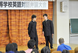 英語力だけでなく、表現力や演技力も審査のポイントとなるこの対話型の弁論大会では、小道具などを使った動きのあるスキット(寸劇)で、2人の息の合ったやり取りが見物です。今回は12校20組、計40名のエントリーがあり、いじめの問題から恋の悩みまで、高校生ならではのテーマで会場を沸かせました。