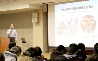 外国語学部の学生を対象にして行われたこの講座は、講師に国際協力機構JICA横浜 海外移住資料館学芸担当の小嶋茂さんをお迎えし、「日本人海外移住の歴史と日系人」をテーマに講演していただきました。
