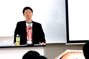 続いて、アートディレクターでメリープロジェクト代表の水谷孝次さんの記念講演会が行われました。メリープロジェクトとは、世界中の子供の笑顔の写真でイベントをデザインするもので、愛知万博や北京オリンピックの開会式のお仕事などを熱く語っていただきました。