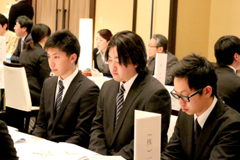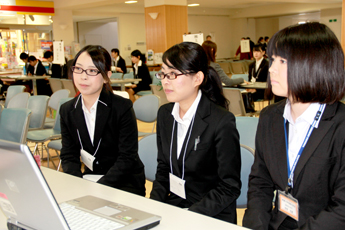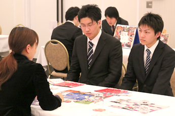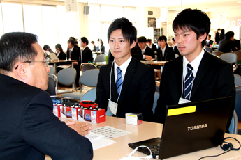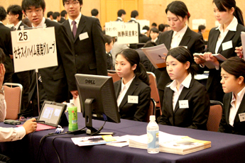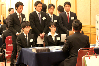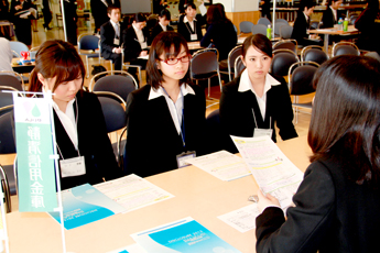 スーツ姿の学生たちはノートを片手に各企業のブースへ積極的に訪問し「事業内容」や「求められる人材」など企業担当者の説明に対し、真剣な眼差しで臨んでいました。