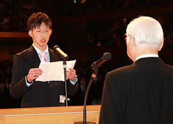 新入生を代表し、中田圭輔さん(保健医療学部作業療法学科/浜松湖東高校卒)が「学生の本分と役割を自覚し、これからの社会に対応できる力を身に付けたい。自己の目標達成のため、精いっぱい努力します」と宣誓しました。