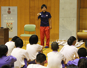石田さんは、4月に行われた世界学生トライアスロン選手権日本代表に選出され、団体3位、個人14位というすばらしい成績を収めました。日本代表にまで登りつめた石田さんが、生徒たちにこれまで経験した苦労や努力を語りました。レースの失敗から学んだ練習方法や、これまでに出会った指導者や関係者の人たちへの感謝を忘れないことなどを話してくれました。生徒たちは、自分と年齢が近く、お姉さんのような存在の石田さんの話を夢中になって聞いていました。