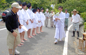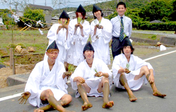 白装束に烏帽子をかぶるのが正式な御神事で、地域のお年寄りの方に着替えさせていただき、お浄めの儀式を行った後、田植を行いました。