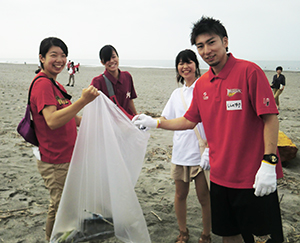 浜松・東三河フェニックスを率いるキャプテン大石慎之介選手は、本学健康プロデュース学部心身マネジメント学科の卒業生であり、お世話になった浜松に貢献したいとの思いから中田島砂丘の清掃を発案し、ThunderBirdsの企画・運営により、学生(ThunderBirds、経営学部 中津川ゼミ、女子バスケットボール部など)、フェニックス関係者、ブースター、ボランティアなど120名が参加し、約190kgのゴミを集めました。