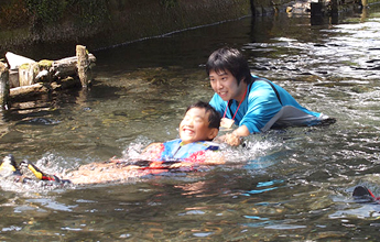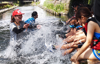 新人隊員として市内の小学4~6年生34人が参加。総隊長には社会環境学部の山田辰美教授を迎え、新人隊員のリーダーとして自然体験活動研究会の学生18人も参加しました。新人隊員の児童は、指導綱引きや水鉄砲、川流れなどの川遊びや田宿側に生息するカルガモ、アユ、手長エビなどの生き物探しなどを繰り広げ、水辺に親しみました。