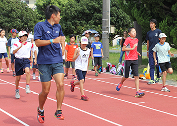 3、4年生は里監督が指導、5、6年生は田中キャンパス長の立ち合いのもと陸上競技部員が指導しました。