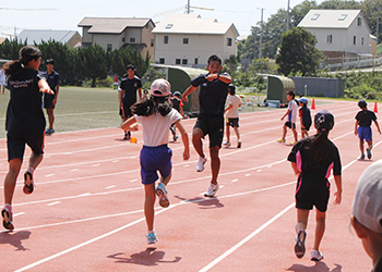 子どもたちは開始前に、50mのタイムを測り、その後トレーニング。「速く走るために自然体で楽しもう」と田中キャンパス長は子どもたちに呼び掛けました。そして、もう一度タイムを測り、練習前後のタイムの違いを確認しました。