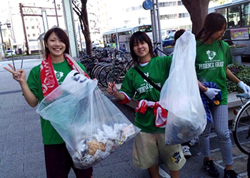 清掃活動はボランティアサークル「ThunderBirds」が中心となり約2時間行われ、本学健康プロデュース学部心身マネジメント学科卒業生でフェニックスのキャプテンでもある大石慎之介選手をはじめ、フェニックス関係者や、本学学生、一般市民など約150名が参加しました。参加した学生からは「商店街の方に感謝の言葉をかけてもらいやりがいがあった」との声も聞かれ、地域とつながる貴重な機会となりました。