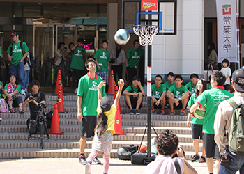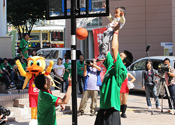 プロバスケットボールチーム「浜松・東三河フェニックス」と本学浜松キャンパスとの共同企画で、地域貢献を通してフェニックスと支援者との団結力を図ることを目的とした「フェニトコ・プロジェクト」が9月23日(日曜日)に、浜松駅前商店街にて開催されました。7月に続く第2弾で、今回は、まちなか清掃活動とフリースロー大会を実施しました。