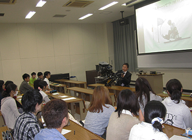これは「障害者スポーツ」の講義の一環で行われたもので、講義を履修する理学療法学科、作業療法学科の1年生44名に加えて、聴講を希望した保健医療学部の学生や教職員も講演に聞き入りました。