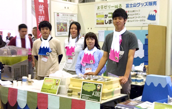 今回の「紙フェア」ではそのお茶ゼリーと、富士山グッズ(メガホン・タオル・コップなど)を販売し、ゼリーは200個を完売しました。また、お茶に関するアンケート調査も実施しました。