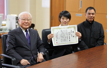 第8回静岡県メディア・ユニバーサルデザインコンテストで最優秀賞を受賞した、造形学部4年の篠原今日子さんが学長へ優秀賞受賞の報告をしました。