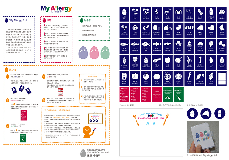 受賞作品の「My Allergy まい・あれるぎー」は、食物アレルギーを持つ子どもが外食(学校の給食含む)の際に使用するツールであり、どのようなアレルギーを持っているかを前もって提示することにより、その食品を誤って摂取してしまうリスクを減らすためのものです。