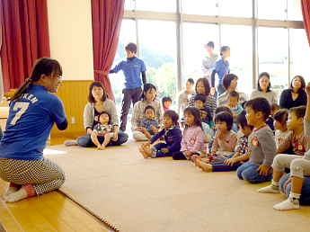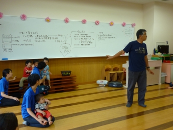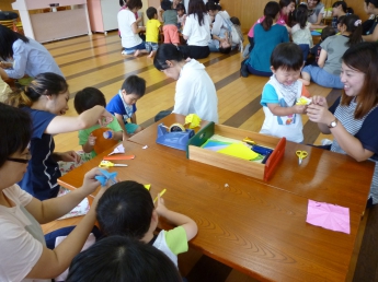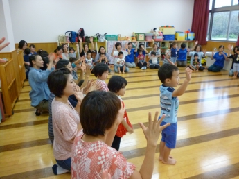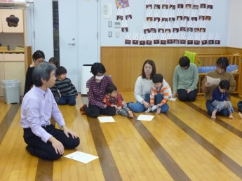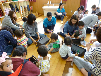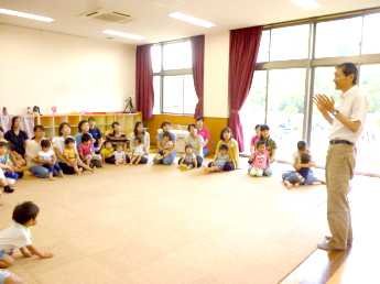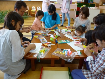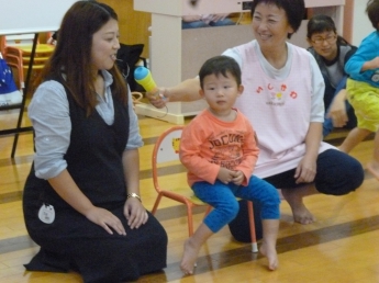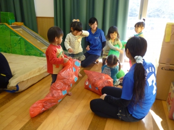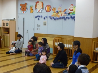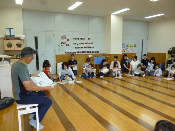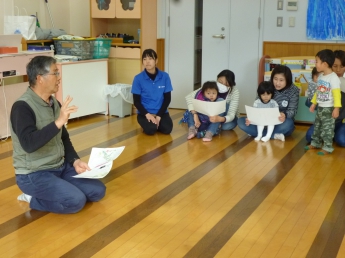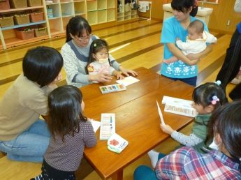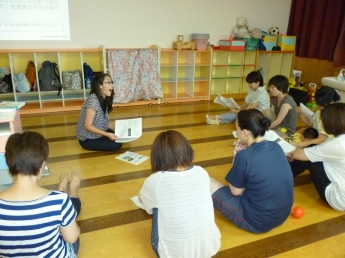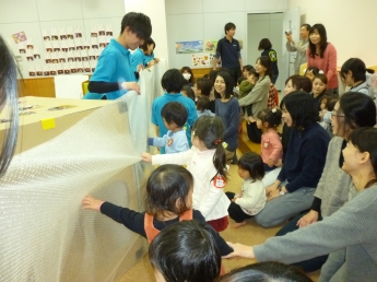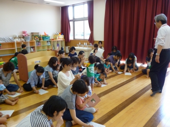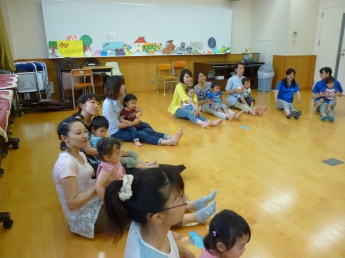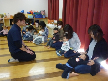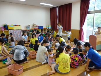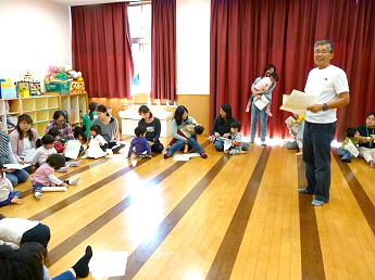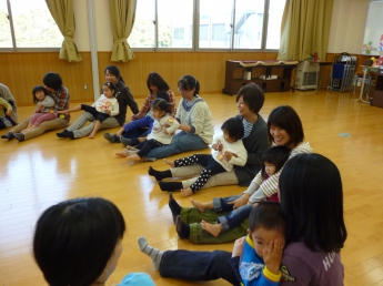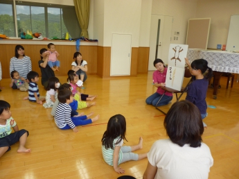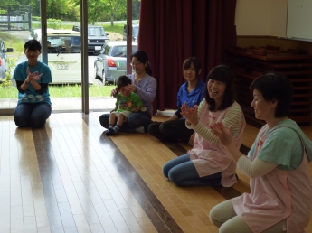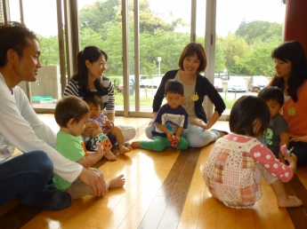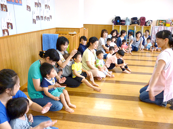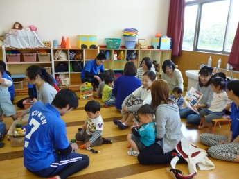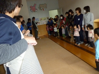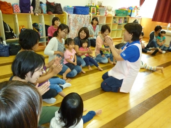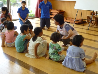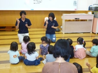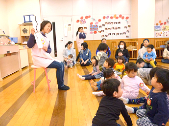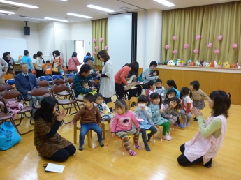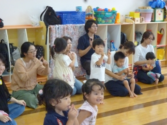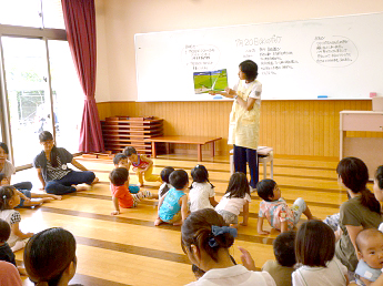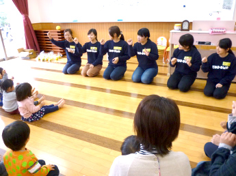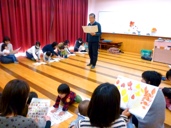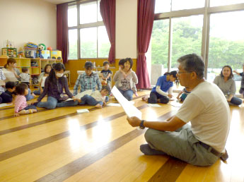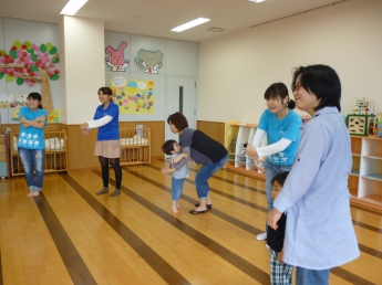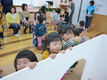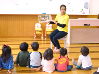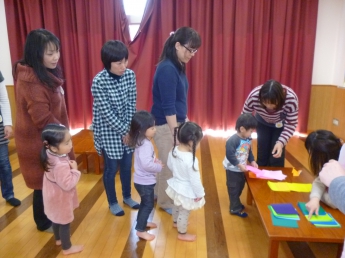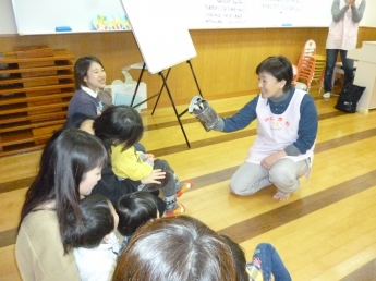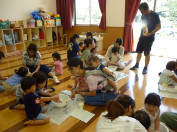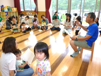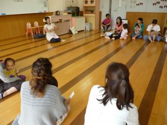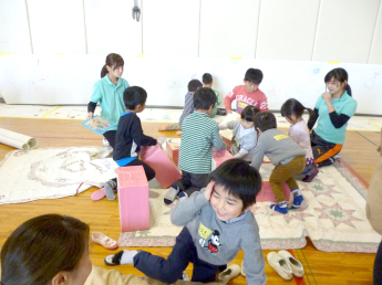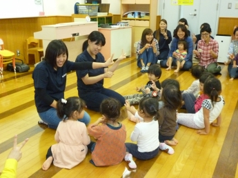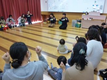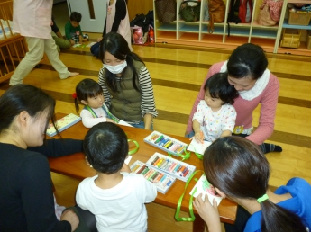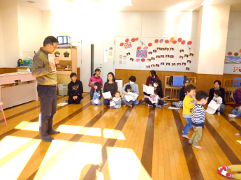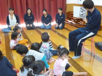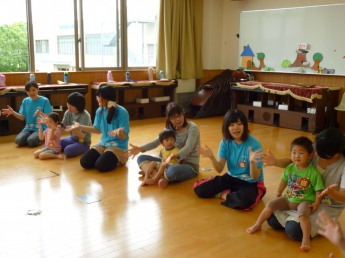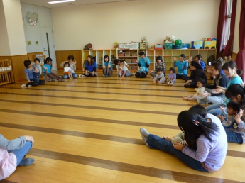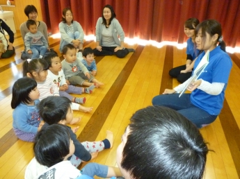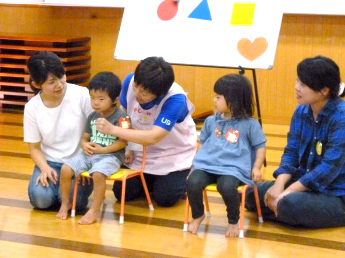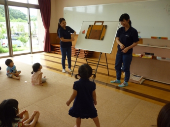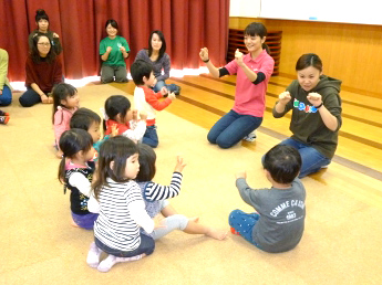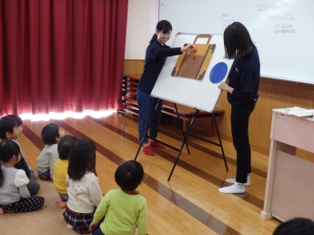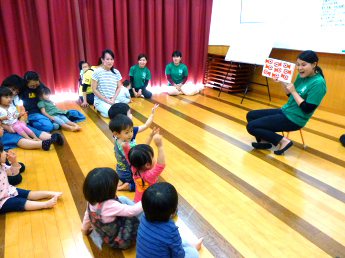 始める前に、お姉さんやお兄さんが形や色に興味が沸くような手遊びや絵本の読み聞かせをしてくれました。