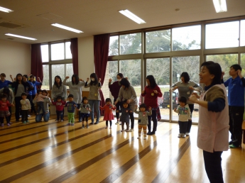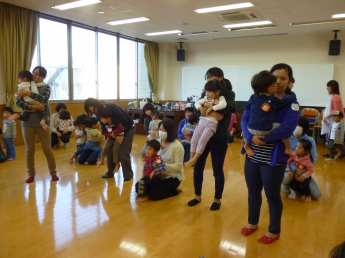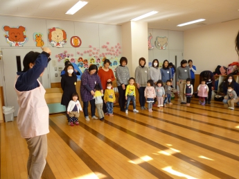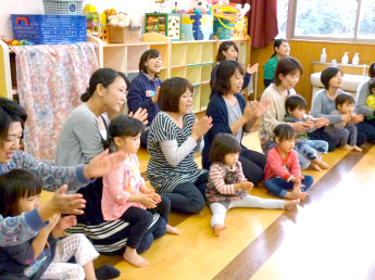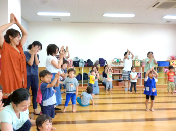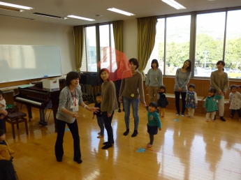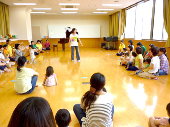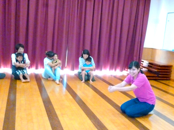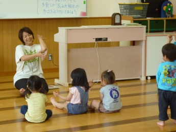 その前に体を動かしたり、お歌を歌いましょう。加藤先生のピアノに合わせ、お姉さん先生をお手本に、さあ、親子でのお楽しみタイム