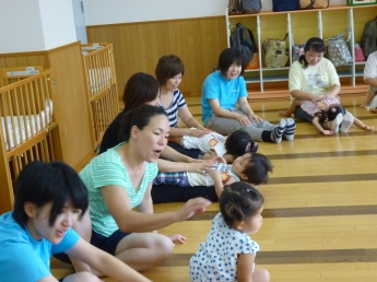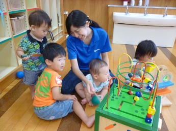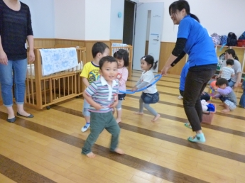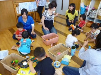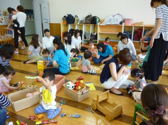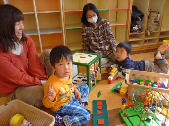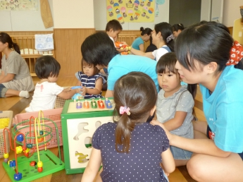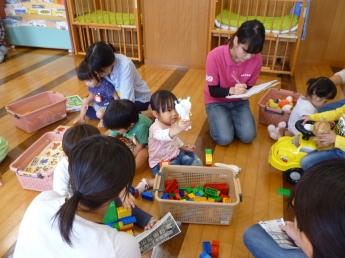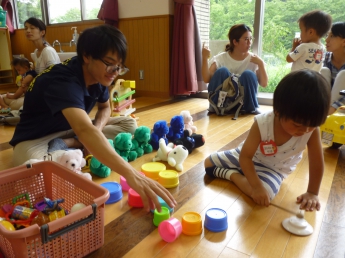 ポッケの主活動が始まる前の時間は、自由遊びの時間です。春の頃は、ママから離れることが出来なかった子ども達も、今ではすっかりママから離れてポッケのお姉さん達と楽しく遊んでいます。