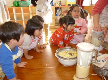 大豆から作る豆乳作りに挑戦です。ゲーテ先生から、豆乳と豆腐のお話を聞きます。