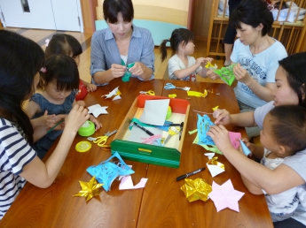 今日はみんなで七夕飾りを作りました。お星様や、すいか・提灯など作ります。