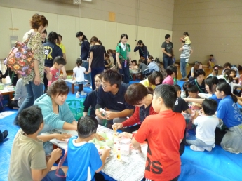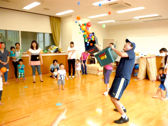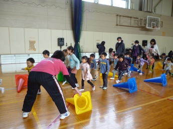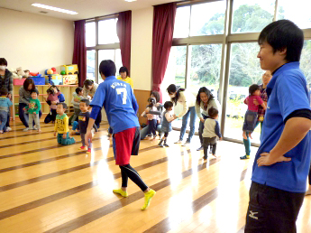 こども健康学科のスッパマン先生こと磯谷先生のご指導の下、親子で楽しむ幼児運動を行いました。